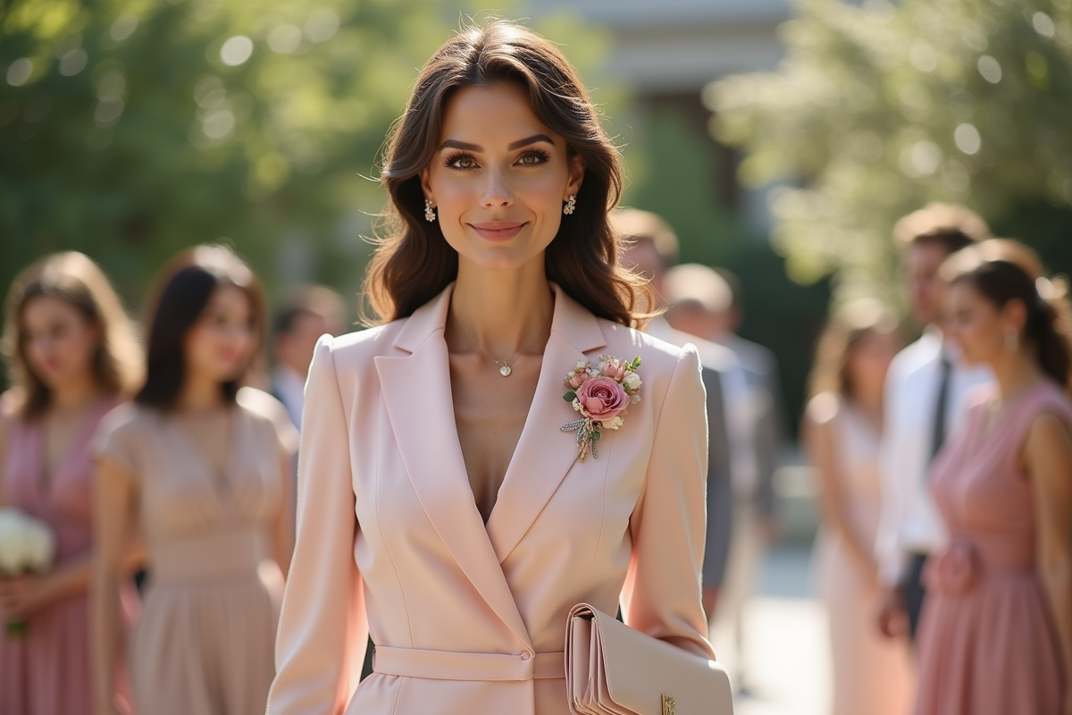 Composer un jeu de couleurs subtils élève le tailleur-pantalon au rang des tenues de mariage les plus désirées. Fuyez la tentation du ton sur ton : misez sur les couleurs pastel (rose poudré, vert sauge, bleu ciel) pour une douceur assumée, ou osez les couleurs vives (fuchsia, corail, bleu électrique) si le contexte s’y prête. Le blanc, réservé à la mariée, invite à nuancer : ivoire, crème, champagne distinguent subtilement l’invitée.